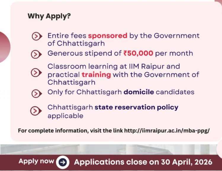 यह फेलोशिप विशेष रूप से छत्तीसगढ़ के मूल निवासियों के लिए उपलब्ध है तथा इसमें राज्य शासन की आरक्षण नीति लागू होगी। इच्छुक अभ्यर्थी विस्तृत जानकारी एवं आवेदन के लिए IIM रायपुर की आधिकारिक वेबसाइट पर निर्धारित तिथि तक आवेदन कर सकते हैं।