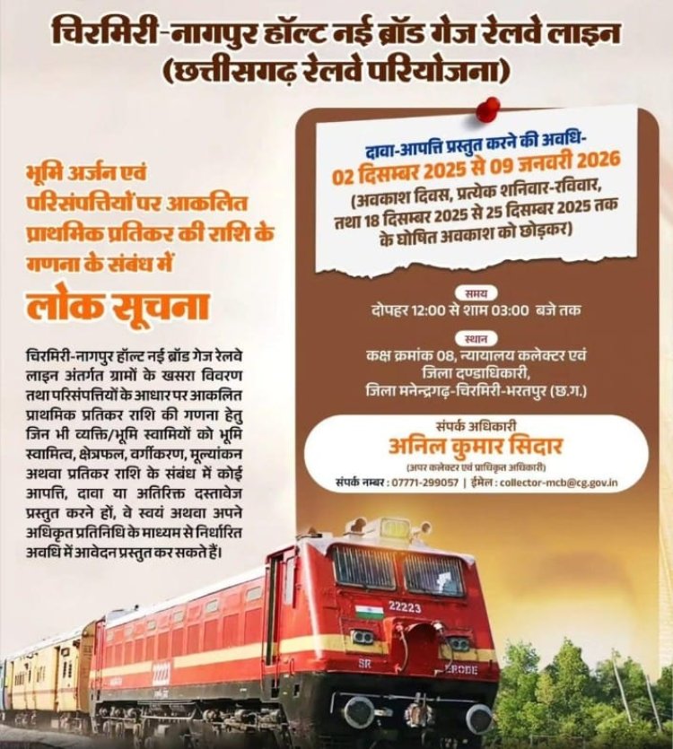 मनेंद्रगढ़। छत्तीसगढ़ रेलवे परियोजना के अंतर्गत चिरमिरी-नागपुर हॉल्ट नई ब्रॉड गेज रेल लाइन के लिए प्रभावित ग्रामों की भूमि एवं परिसंपत्तियों के संबंध में आकंलित प्राथमिक प्रतिकर राशि की गणना हेतु जिला प्रशासन ने लोक सूचना जारी की है। जिन भूमि स्वामियों को स्वामित्व, क्षेत्रफल, मूल्यांकन या प्रतिकर राशि पर आपत्ति है, वे निर्धारित अवधि में दावा प्रस्तुत कर सकते हैं।