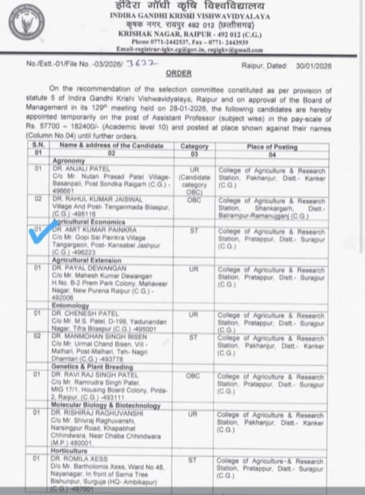 रायपुर/जशपुर: छत्तीसगढ़ के शैक्षणिक गलियारे से एक गौरवपूर्ण खबर सामने आई है। इन्दिरा गांधी कृषि विश्वविद्यालय (IGKV), रायपुर ने सहायक प्राध्यापकों के रिक्त पदों के लिए नियुक्ति आदेश जारी कर दिया है। इस प्रतिष्ठित सूची में जशपुर जिले के ग्राम टाँगरगाँव (कंसबेल) के निवासी डॉ. अमित कुमार पैंकरा ने अपनी जगह बनाई है।