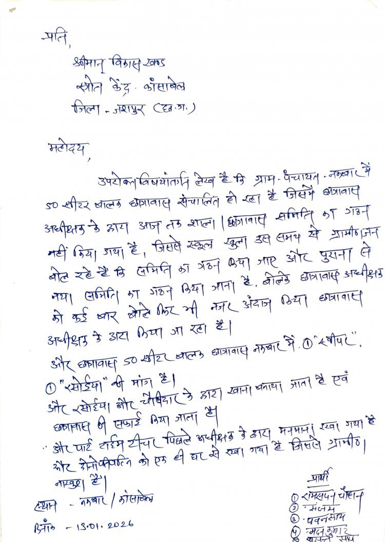 कांसाबेल: छत्तीसगढ़ के जशपुर जिले के ग्राम पंचायत नकबार स्थित 50 सीटर बालक छात्रावास में अव्यवस्थाओं का मुद्दा गर्माता जा रहा है। ग्रामीणों की शिकायत के बाद छात्रावास अधीक्षक द्वारा दिए गए स्पष्टीकरण ने नए विवाद को जन्म दे दिया है, जिसमें मूलभूत सुविधाओं की मांग को ही गायब कर दिया गया है।