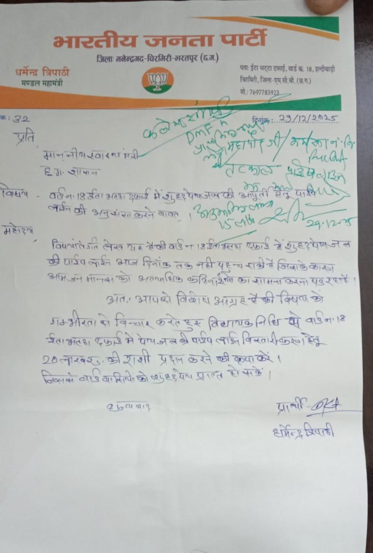 जिसे देखते हुए भाजपा चिरमिरी मंडल के महामंत्री धर्मेंद्र त्रिपाठी ने 29 दिसंबर 2025 को क्षेत्र के विधायक एवं प्रदेश के स्वास्थ मंत्री श्याम बिहारी जायसवाल को उपरोक्त मामले में एक ज्ञापन देकर ईटा भट्ठा दफाई में पाइप लाइन के विस्तार हेतु राशि स्वीकृत कराने की मांग की थी ।