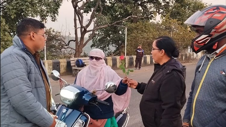 पुलिस ने हेलमेट नहीं पहनने व सीट बेल्ट नहीं लगाने वाले वाहन चालकों को आम नागरिकों से गुलाब का फूल देकर दिलाई समझाइश,