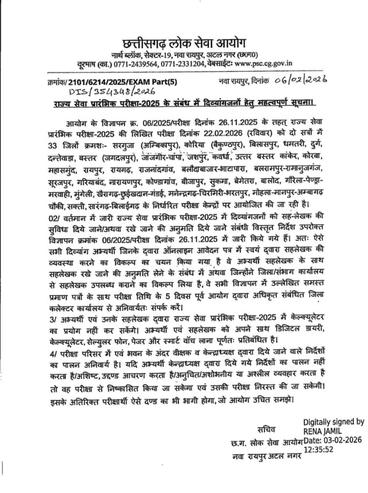छत्तीसगढ़ लोक सेवा आयोग ने राज्य सेवा प्रारंभिक परीक्षा 2025 के लिए एडमिट कार्ड जारी कर दिया है. जिसके अनुसार, CGPSC की प्रारंभिक परीक्षा प्रदेश के सभी 33 जिलों के परीक्षा केन्द्रों में 22 फरवरी 2026 को आयोजित की जाएगी.