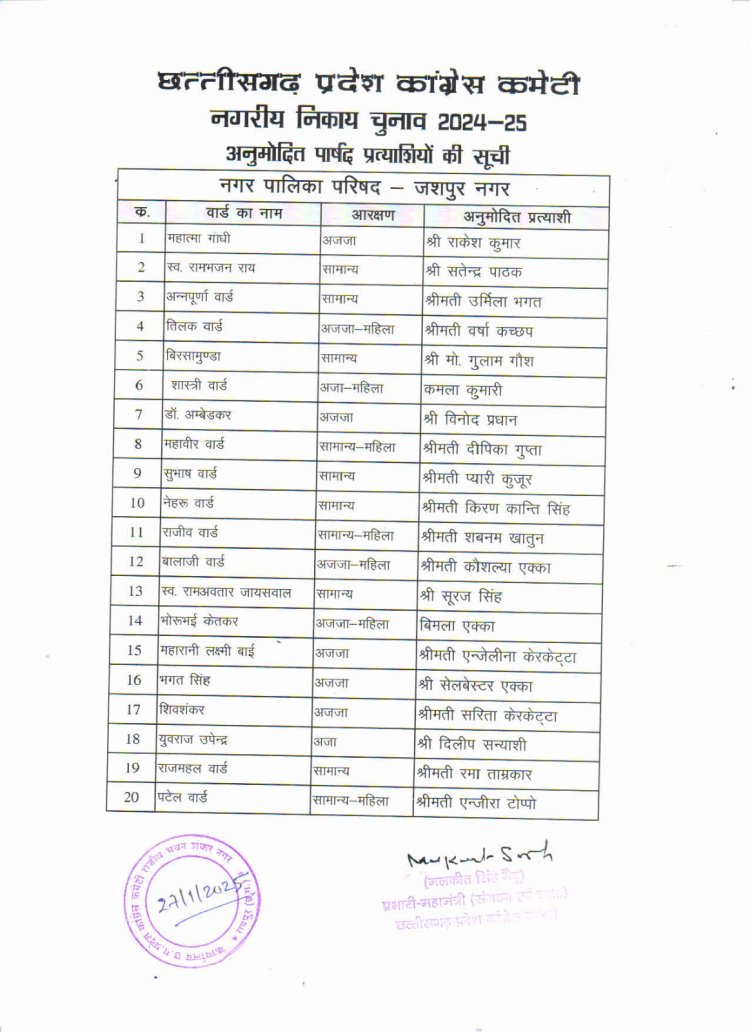 कांग्रेस ने जारी किया पार्षद प्रत्याशियों की सूची,नगरपालिका जशपुर में इन्हें बनाया गया प्रत्याशी,देखें पूरी सूची